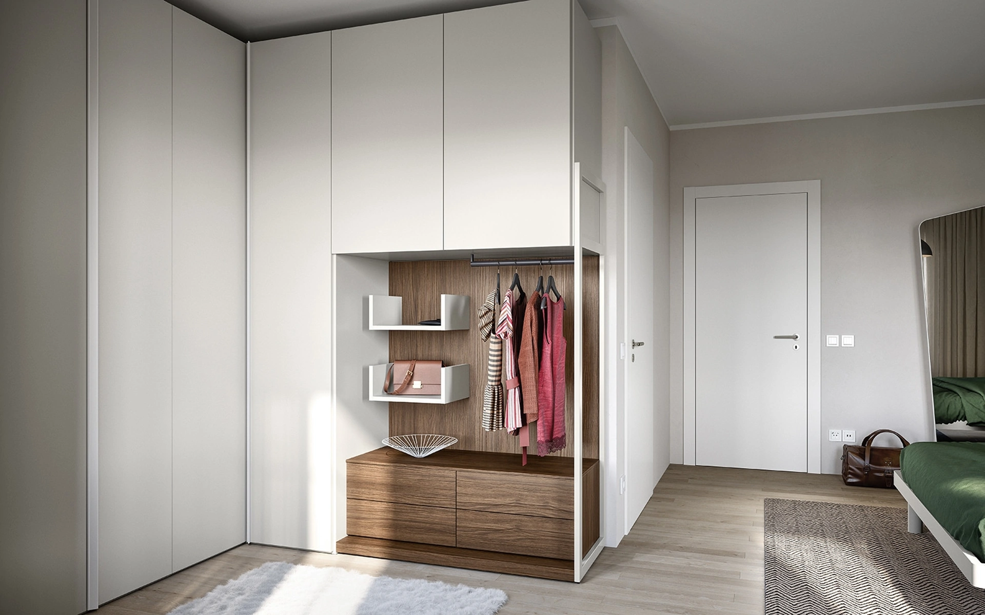 Qualità e comfort sono gli aspetti che, unitamente a un certo stile, distinguono tutti gli Armadi ad angolo moderni del marchio Cinquanta3. Se desideri creare una stanza bella e funzionale, compila il form o visitaci per ottenere infromazioni, complementi e accessori nell'ambito dell'Arredamento Casa. Armadio angolare con anta battente 09A di Cinquanta3 in melaminico: in un ricco catalogo di mobili ed elementi accessori, questo modello ti farà ultimare la tua zona notte come l'avevi immaginata. Venire in negozio vuole dire visionare in prima persona tanti prodotti del noto e rinomato marchio, sempre di alto contenuto estetico. Una ampia offerta di arredi in melaminico come questo guardaroba con ante battenti in foto.