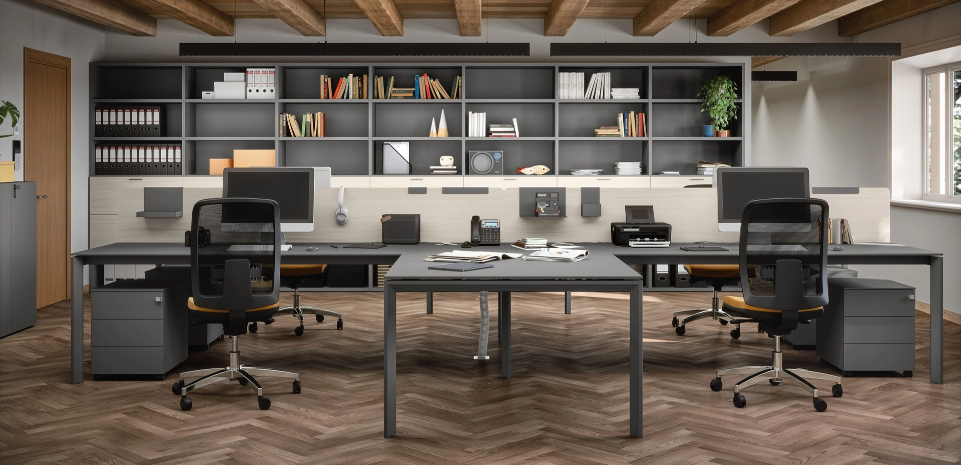 Mobile Ufficio Libreria 04C di Cinquanta3: ideale per ultimare glispazi lavorativi garantendo l'agio di chi ci lavora, con una buona resa estetica. Al giorno d'oggi l’Arredo Ufficio deve soddisfare le esigenze di funzionalità e comfort per chi svolge il lavoro, quelle di accoglienza e serietà prima di tutto per i clienti. Il noto e conosciuto marchio lavora sempre al passo con le necessità personali, di fatto offre a catalogo ogni sorta di Arredo Ufficio in melaminico. Nel nostro showroom proponiamo molteplici composizioni arredative con librerie per ufficio Cinquanta3 in melaminico, sempre in materiali durevoli e resistenti nel tempo.